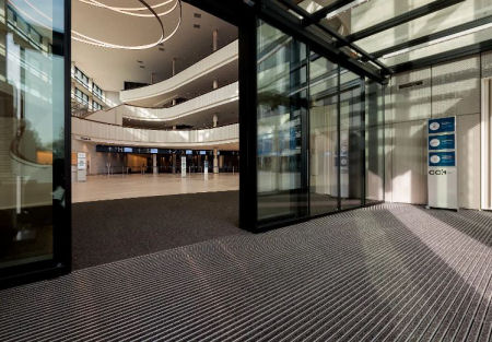 Felpudo de entrada al edificio, capaz de soportar cargas normales y pesadas, sistema Diplomat 522P "EMCO", con capacidad de retención de partículas finas de suciedad y absorción de la humedad existente en el calzado, formado por perfiles de aluminio anodizado, acabado natural, de 22 mm de altura, 27,5 mm de anchura, unión entre perfiles con cable de acero galvanizado de 4 mm de diámetro y vaina exterior de PVC, distancia entre perfiles 5 mm, con inserciones modelo Premium Care, color Antracita 47.01, adherencia R-12, según DIN 51130, inserción textil de poliamida 6 Euroclase Cfl-s1 de reacción al fuego, según UNE-EN 13501-1. COLOCACIÓN: sobre cajeado en pavimento. | ||